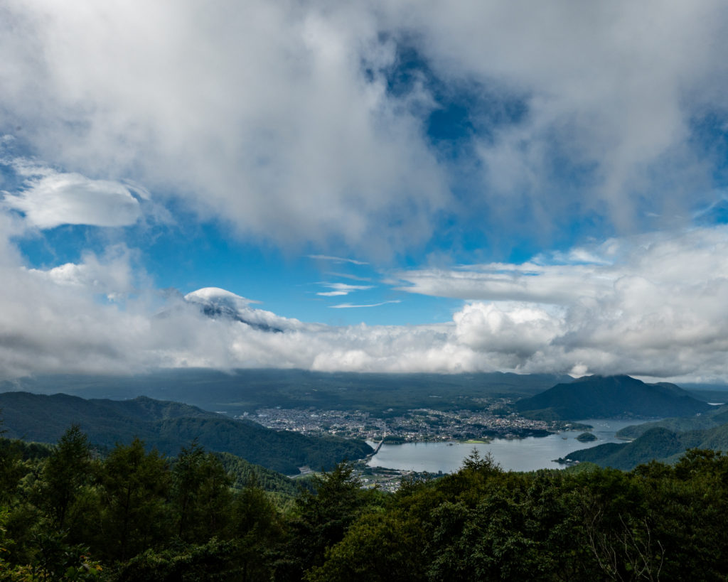 目的のポイントに着いて、山中湖半撮影と同じNikonZ6と標準ズーム、広角単焦点の2本を持って、200mほど山道を歩いて撮影場所に着いたら、雲が流れていて待てば撮れるかもしれない雰囲気です。