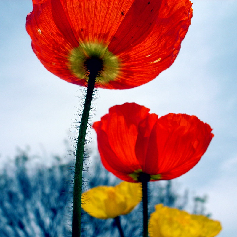 ファインダーはなく背面液晶に表示される画像を見てシャッターを押すのですが、この時はいわゆるノーファインダーで撮っています。カメラを地面に置いてポピーの花弁の下から上向きに数枚撮った中の1枚です。