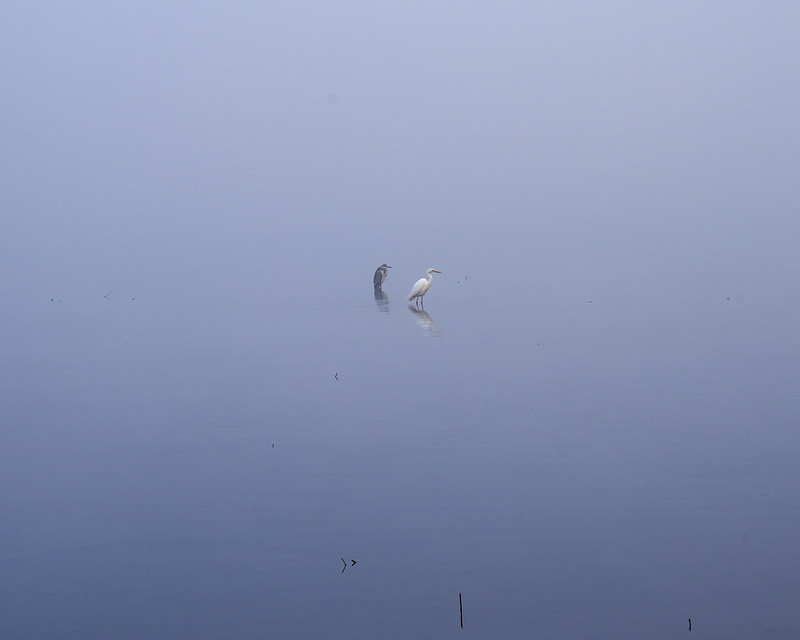 写真は青鷺と白鷺、雲に包まれた山中湖畔での1カット。